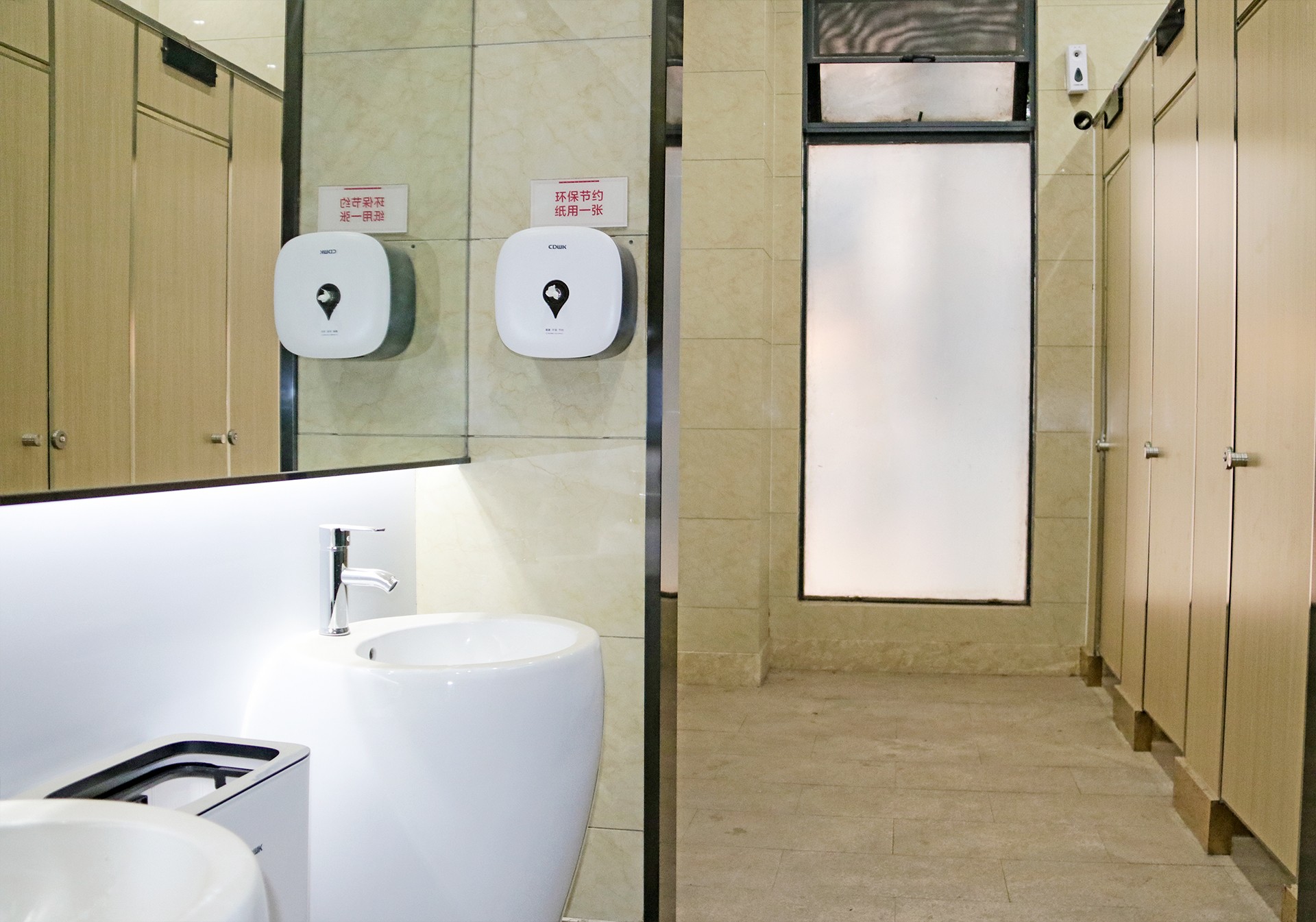 人們通過(guò)屏幕可以看到當(dāng)日的人流量、當(dāng)前的使用情況外,還能實(shí)時(shí)監(jiān)控廁所內(nèi)氨氣和硫化氫等有臭/毒氣體與環(huán)境濕度與溫度,自動(dòng)控制空調(diào)、排風(fēng)系統(tǒng)結(jié)合自動(dòng)噴香機(jī)調(diào)整空氣環(huán)境,營(yíng)造干凈舒適的廁所環(huán)境。