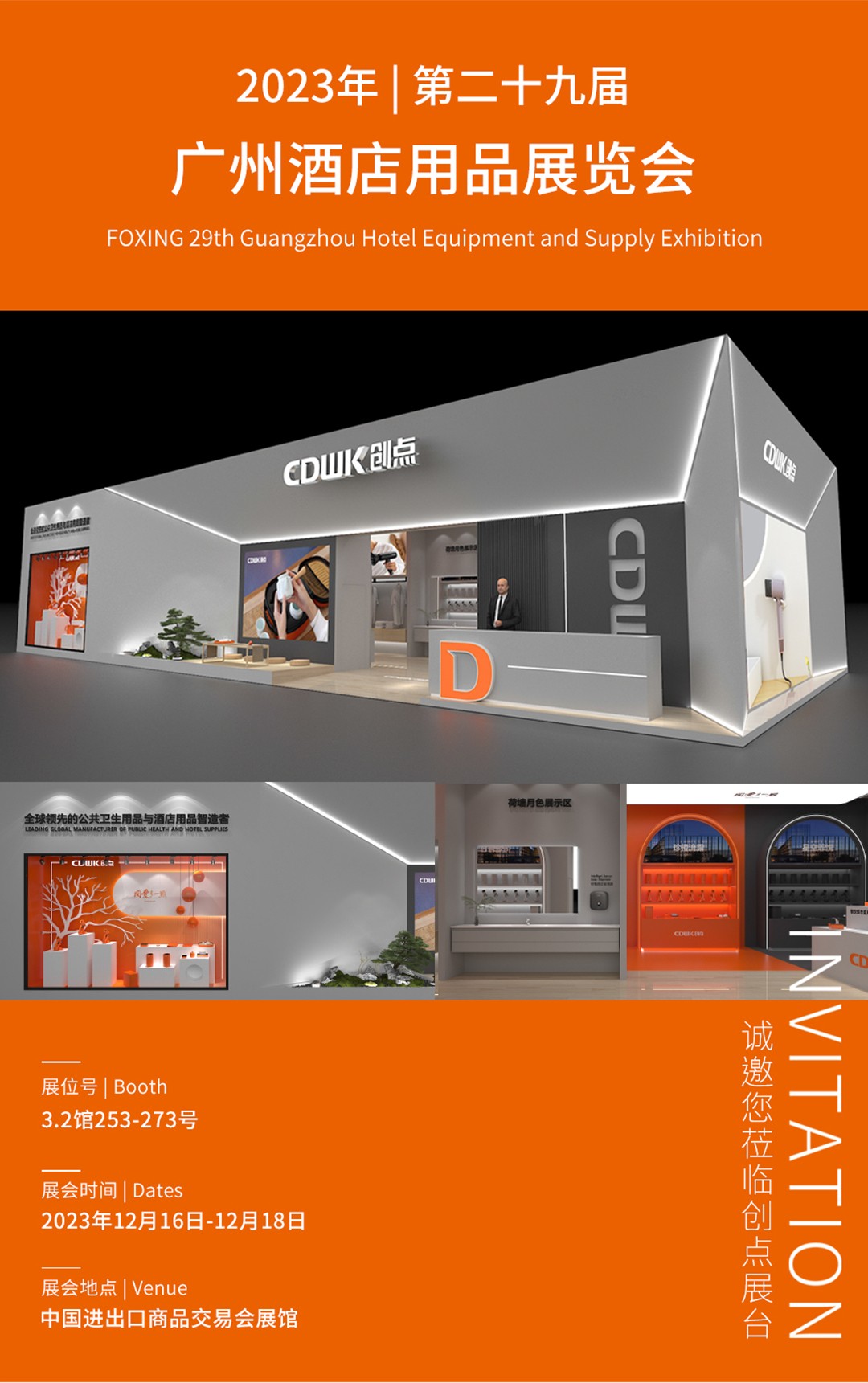 12月16-18日,2023年年末最大盛會—創點酒店用品展覽會在廣州盛大開展,在此,我們非常榮幸地邀請您參加,本次展會現場我們準備了很多驚喜,特此誠邀您的到來!